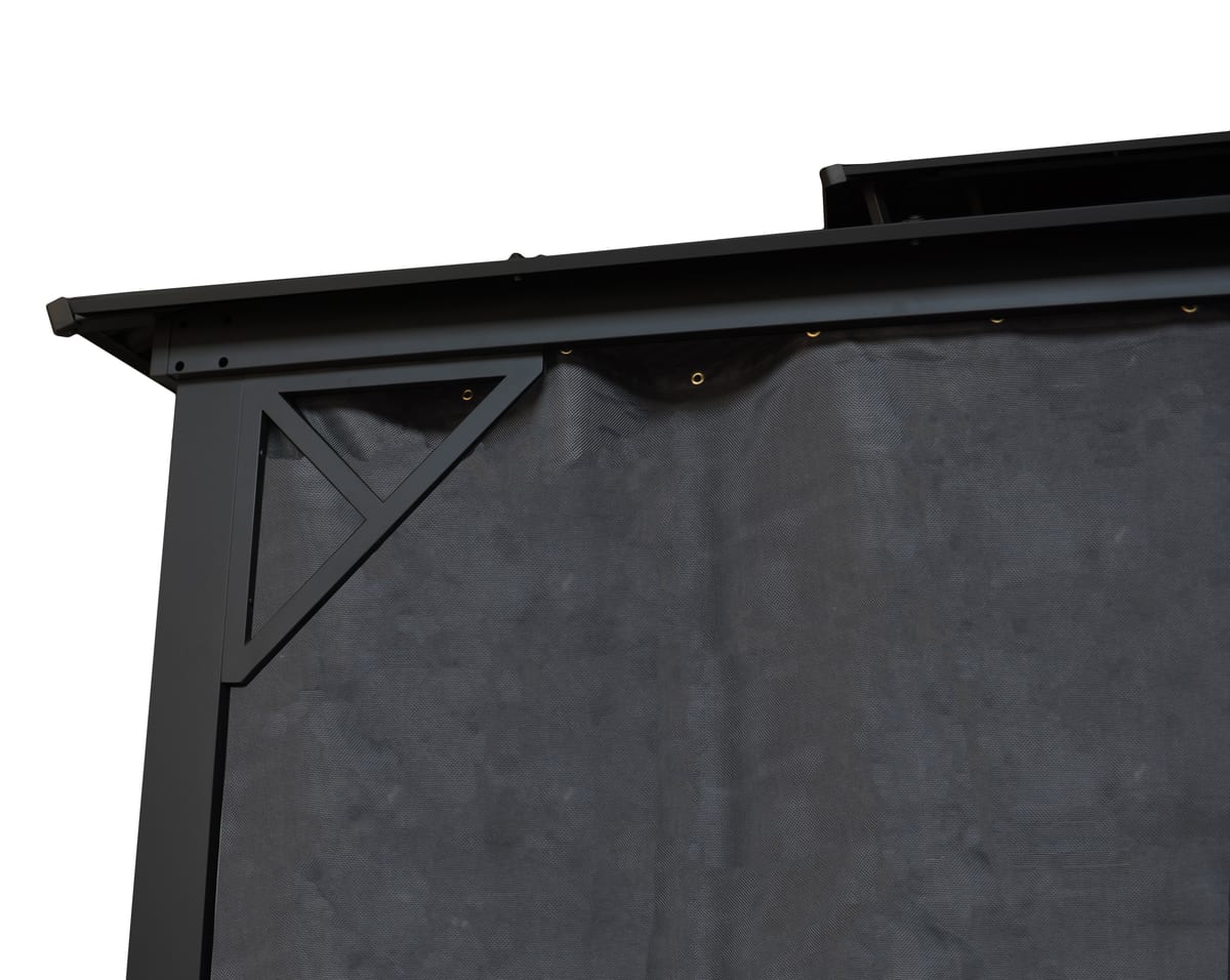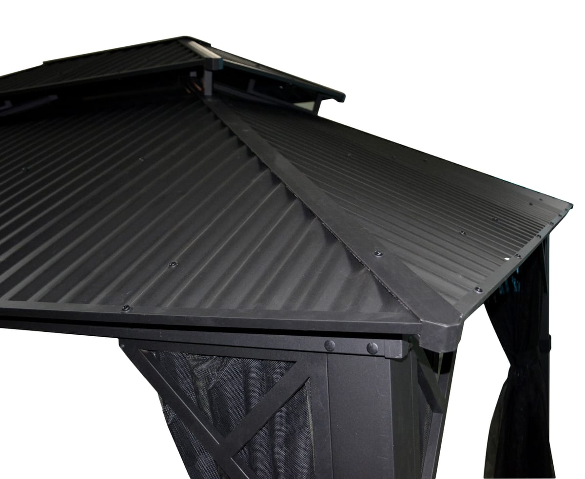 Structure 100% aluminium robuste avec toit en Galvalume compose d’acier et aluminium. Moustiquaire en Textilene incluse.