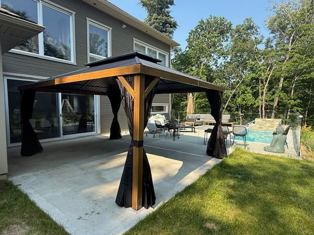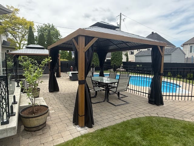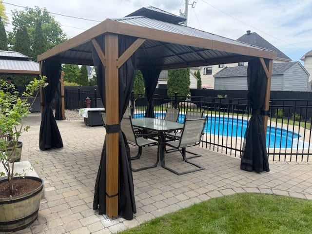 Structure en aluminium avec toit double ventilé renforcé de panneaux d’acier galvanisé de 0,45 mm protégeant des UV. Moustiquaires ignifuges incluses. Crochets intérieurs pour suspendre des accessoires. Rideaux d’intimité disponibles séparément.
